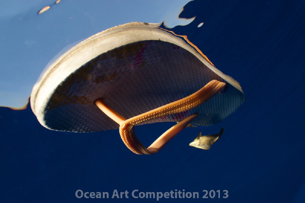 A juvenile triggerfish finds shelter under a sandal, Eilat, Red Sea