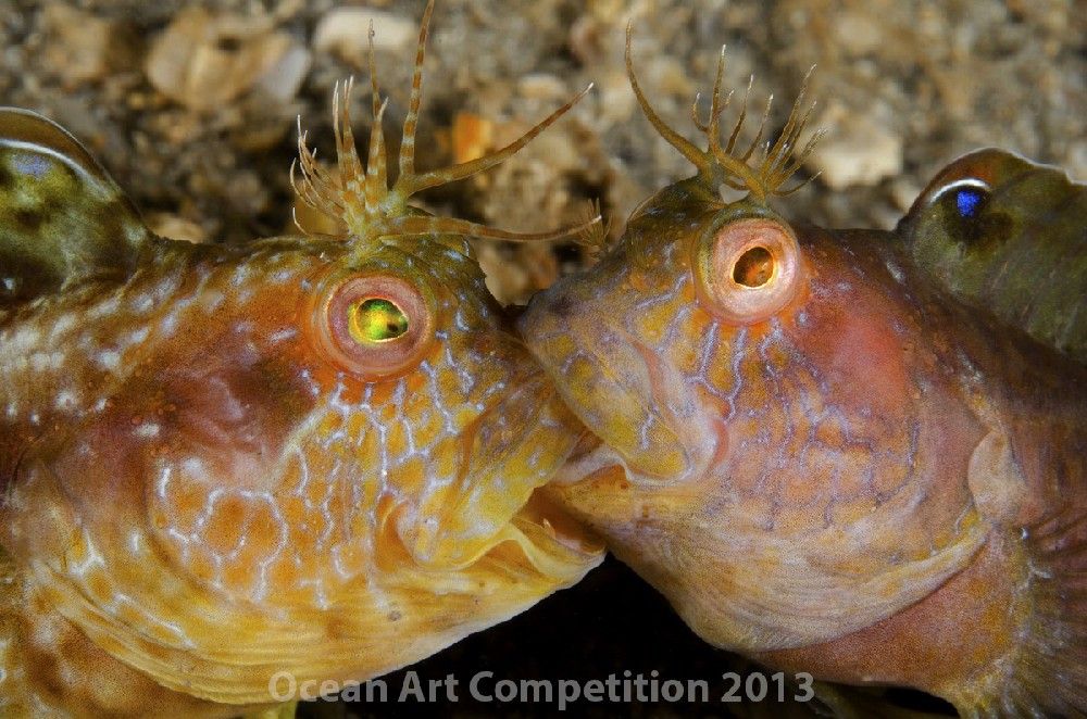 Two blennies lock jaws in a fight, Blue Heron Bridge, Riviera Beach, Florida