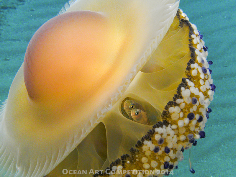 The story: I took this shot using my first equipment for uw-photography back in 2010 in the costal waters of Giglio Island in the Med. Sea. Actually, I had just purchased the Sealife Bundle and it was one of my first dives with a camera under water! I got all excited when I saw the beautiful medusa Cotylorhiza tuberculata near the surface and hurried there to take a picture. Coming closer and having made the first shots, I discovered juvenile fishes hiding inside the medusa. I'm a marine biologist and thus knew about the behavior of juvenile teleost fishes belonging to different genera (Trachuru, Seriola) to swim with this cnidarian species and to hide inside the medusa for protection purposes, but I had never seen it myself. It took me quite a time and sure enough a stately number of shots to capture the moment, this very short instant, where the medusa's umbrella was flapped up so that the fishes were in sight together with correct focusing, exposure etc.
