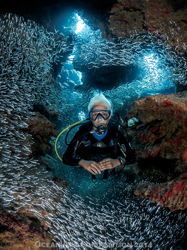 The story: For a few weeks a year, the Silversides appear in vast amounts in and around the grottoes, docks, and reefs of Cayman. As part of diver and good friend Gemma Smith’s professional portfolio, we headed to where the seasonal Silversides had gathered, knowing the potential for uniquely entrancing images. As a team, we concentrated on creating an image that would show off the diver, Silversides, and surrounding cavernous walls to full effect. The resulting photograph is meant to showcase the diver in harmony with the underwater realm and ocean life.