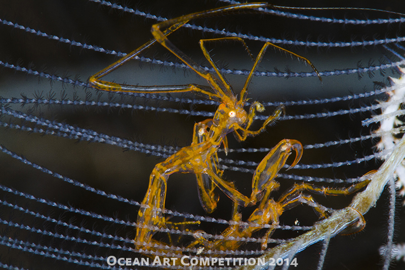 This was my first time using a super macro convertor, and only my third dive. A whole new world opened up to me when i saw a colony of skeleton shrimps through my external view finder. It was absolutely fascinating as i could never have discerned all this hustle bustle and busy activity that they are involved with without the SMC, especially as i am at an age where i use readers on my dive mask. It took a while to get this shot as there was a mild current, the soft coral on which this skeleton shrimp was on kept swaying, and the shrimp kept moving, particularly bending down and doing something to the “strings” of the coral. Elbows tucked carefully in the sand i started to take a few shots. It took over 40 minutes to get just a few decent shots. To me this shot looks like the shrimp is playing a harp.