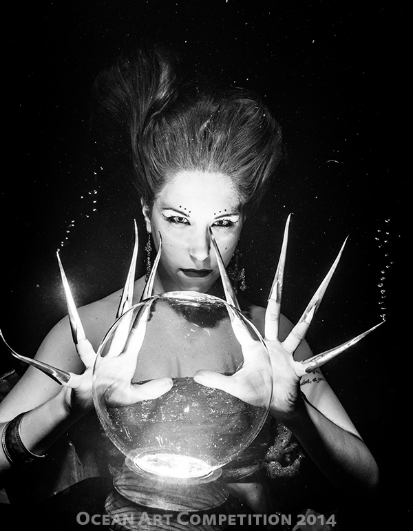 The story: This image was inspired by witches and their crystal balls, creating the metaphor to see the future under water, as if we wanted to predict the future of our oceans. The intense witch's look holds the observer in this magical underwater fantasy.