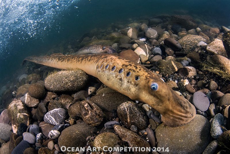 The lamprey uses its suction cup-like mouth to attach itself to the skin of a fish and rasps away tissue with its sharp, probing tongue and keratinized teeth. Secretions in the lamprey's mouth prevent the victim's blood from clotting. Victims typically die from excessive blood loss or infection. After 1 year of hematophagous feeding, lampreys return to the river to spawn and die, one year and a half after the completion of metamorphosis. In this picture we can see two lampreys portrayed in a river bed very close to its exit to the Mediterranean sea, they were coming back to the river for the final acts of their life cycles.