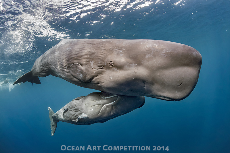 The story:  A sperm whale swimming gently and quietly with her calf in the calm and warm waters in front of the island of Dominica, Western Caribbean. Swimming with sperm whales here is an activity strictly regulated by the Dominican government, and only a few permits are issued every year. Only free diving is allowed, and taking underwater pictures can be possible only with ambient light (no strobes). All these precautions are taken not to disturb too much the habits of these gentle giants. Encounters with sperm whales are very common here, but the sperm whales are very shy so 90% of the time they dive deep as soon as people get into the water. Only a few times they allow people to swim with them, and in one of those occasions we were lucky enough to take some amazing pictures.
