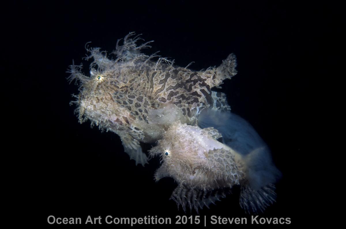 The story: When a female Striated frogfish is ready to spawn she rises towards the surface closely followed by the male. As she releases her egg mass the male fertilizes them.Coming across this Striated Frogfish pair on a local dive, I realized that they were about to spawn so I got prepared to photograph this rarely observed behavior. Shortly afterwards I was very fortunate to press the shutter the exact moment that the female released her egg raft.