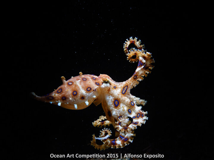 The story: Lembeh are characterized by strange creatures that inhabit it, in addition to their low profile that is usually around 5 meters. I waited for the moment when the blue-ringed octopus is off the ground and begins to swim to take a picture with the help of the snoot RETRA, the idea was to focus only on the blue-ringed octopus and darken the rest of the image.