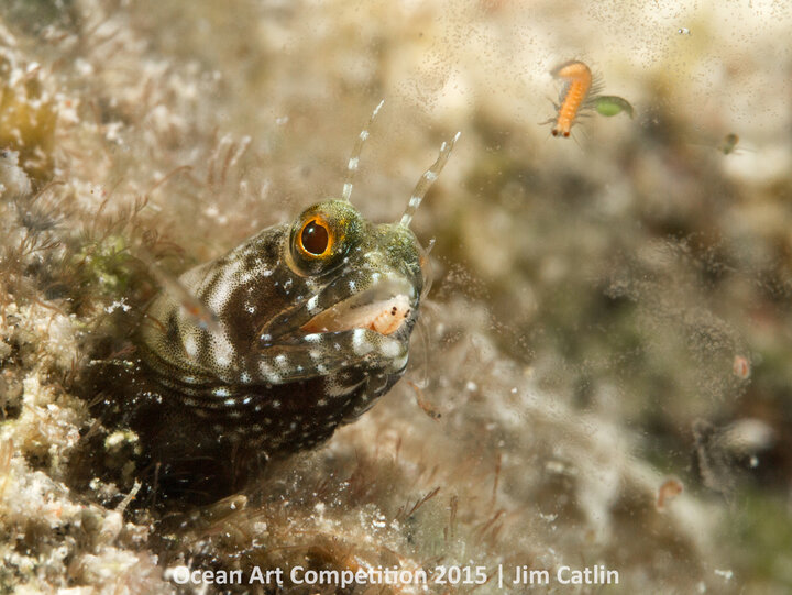 The story:  This shot is of a blenny hunting bloodworms at night. It’s reactions and speed were so fast that the only way to photograph this behaviour was to patiently fire pre-emptively until I captured the shot. For around 35 minutes I waited with him, firing when I thought he was about to strike. My goal was to capture the moment he took the bloodworm in his mouth, something almost impossible to see with the naked eye, fortunately this shot did just that!