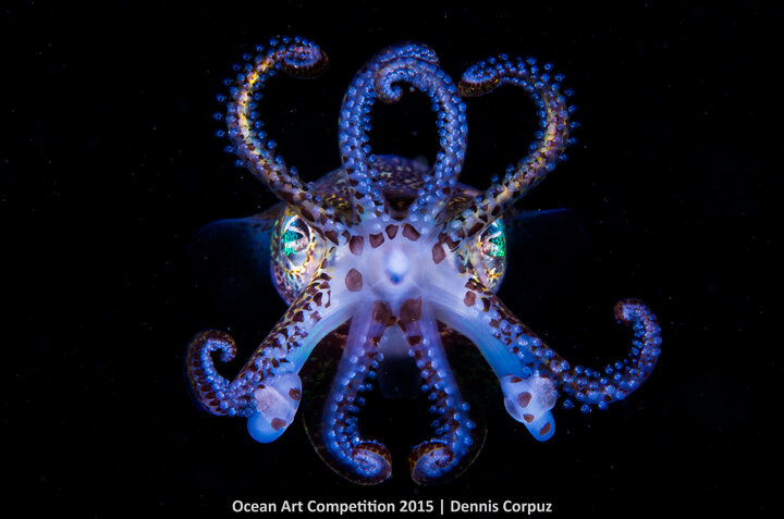 The story: This image was taken during night dive and the location was pretty shallow at just 5m depth. I found plenty of squid during the dive including this one. Not too far away, I saw it hovering as I shone (my light) towards this animal from a distance. I already knew some information about this swimming bobtail squid and so, I gently moved backward to keep the subject undisturbed. I held my pointer down (stainless stick) leading the arrow to the location of the squid (imagine it was dark at night). I made some trial shots while calculating the similar size of the squid including proper settings, strobe position and exact distance. Once done, I gently moved forward to the hovering squid and successfully captured this behavior shot for my first time. So happy to have gotten a few shots, I successfully exited the water.
