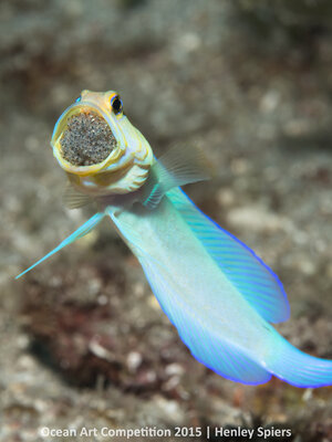 The story: Yellowhead Jawfish incubating eggs in his mouth. With jawfish, and as often happens in the marine world, the responsibility for carrying the eggs falls to the father. Once gathered from the female, the male jawfish will hold the eggs in it’s mouth for 7 – 10 days. During this time he will forsake his own sustenance for the sake of his offspring. He will also occasionally rotate the eggs by spitting them out and shuffling them. This action keeps the eggs well aerated and takes place in about half a second. Having spotted a Yellowhead with eggs whilst teaching a diving course the previous day, I resolved to return and try to get a shot of this incredible behaviour. They are notoriously skittish and will dart back into their burrow at the first sign of a possible threat. Once I identified the pregnant male, I very slowly crept up closer to the jawfish. The first few times he quickly disappeared and I had to retreat. After a few approaches he started to become more habituated to my presence and I was now able to get close enough to shoot one frame before he disappeared again. I was also trying to breathe out as gently as possible as the noise and bubbles would alarm him. My dive time was coming to an end and I resolved to make one last approach. This time, as I crept into position, the Jawfish rotated the eggs in a split second and I was able to capture the moment as he opened wide to momentarily spit them all out!