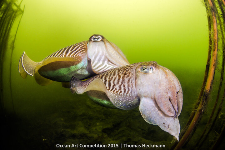 The story: In spring the common cuttlefish Sepia officinalis starts a long voyage for having their annual mating ritual. The animals have to pass a storm surge barrier in the Netherlands. During normal weather conditions this possible border is open and the North Sea is able to pass by. Behind the surge barrier, this Dutch part of the North Sea is called “Oosterschelde”. The spawning place arrived the animals have their “Wedding Dance” within larger groups to form single couples. Has a couple formed once, the male defends his sweetheart compared to other males, if necessary with a wild fight.