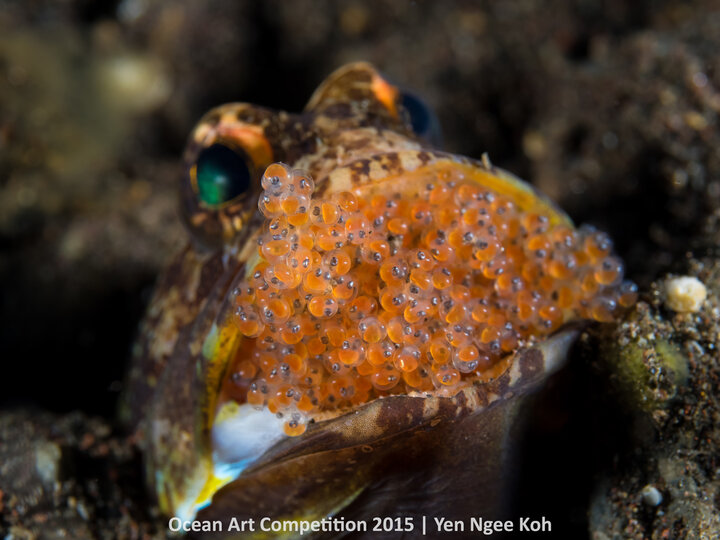 The story: Jawfish with eggs had been on my wish list for a while. Before this shot, I had always failed in my approach whenever I found a jawfish (with or without eggs). This particular dive, the guide excitedly signalled me to follow him. It took me a while before I spotted what he was trying to show me – jawfish with eggs. What was unusual was that the eggs were orange in color! With some patience and guidance from the guide, I was finally successful in approaching the jawfish. After some frontal shots, I noticed that more eggs were spilling out on the top left side. So I decided to shift more to the left and lowered the angle even more, as low as I could. I’m happy to see that it helped to showcase the mouthful of eggs even more.