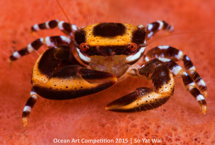 The story: I am always interest in looking for marine creatures in giant barrel sponges since there are a lot of critters like squat lobsters and porcelain crabs. I was really attracted by the colour of this porcelain crab. The biggest difficulty of taking this photo was that the lamented structure of barrel sponge always blocks the strobe light. Therefore I needed to wait for the crab stay near the edge of sponge. Front lighting was also a good way to get rid of blockage by sponge.