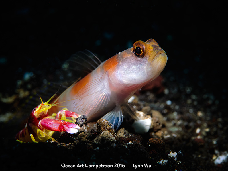 The story: Pistol shrimp and goby are two sea creatures that form symbiotic relationship to survive. The pistol shrimp is an excellent cave builder, but has poor eyesight. The goby uses the shrimp’s burrow for protection from predators, it also acts as “eyes” for the pistol shrimp. The first time that I closed to them, goby swung tail for several times, reminded the pistol shrimp to stay in cave, so I couldn’t shoot the picture they appeared together. I must let them know that I was not threatening, therefore I watched for long time nearby, it took me one tank of time. The next dive, I still selected to shoot them, so I firstly adjusted my flash strobe and snoot angle, thought about the picture that I wanted to show, and then was waiting for long. I slowed down my action, and breathed gently, let goby and pistol shrimp couldn’t hide in the cave. Pistol shrimp went in and out of cave diligently lifted stones, but did not appear in fixed direction, while goby did security work continually. When pistol shrimp lifted out stone and appeared at the angle what I wanted, I shot this single picture. I was very happy I could completely show the symbiotic relationship between them.