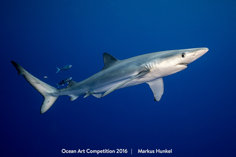 The Story: On our trip through the Acores we arrived in Fajal and stopped over at Norberto Divers, a kind of “Original” of the Acores and known for whale watching and exploring the world down in the ocean, also visiting famous places like Princess Alice Banks and Condor Banks. For visiting the Acores it was rather early in the season – and the warming sun as well as anything big like morbulas or even sharks haven’t been spotted that much. I was especially interested in hopefully spotting some blue sharks at Condor Banks, but learned, that Condor Banks was actually free of sharks this year. In general, the number of spotted sharks at the Acores is going down year by year … somehow might be a bill for catching up to nine blue sharks with long-lines to catch one swordfish – at least finning is banned now from the Acores and hopefully the populations are coming up again. This in mind we approached a new place called Pedro Do Sousa instead of Condor banks, where fishers have regularly brought up squids which has been bitten by blue sharks. The sharks are attracted by ‘chumming’. This starts with tossing chunks of sardines and fish blood overboard. We waited for nearly 2 hours, when suddenly two sharks came up from about more then 400 meters depth to check out the food. Going into the water they where quite curious for some minutes, then diving down again out of sight, any coming back again and circling around us. I was deeply moved by the smart movements and the way, the where focusing their eye on me. Again and again, their moving eyes – somehow knowing every second who is guest and who’s the landlord. Diving into the picture, I still can recall the moment – the moving eyes of the blue sharks focusing on us, with nothing but blue around us.
