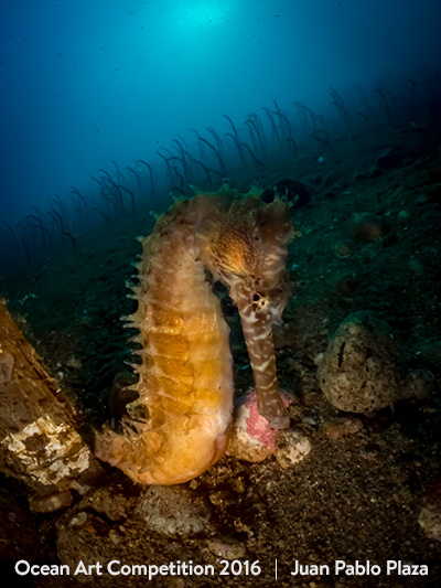 The Story:  Illuminated under light emitted by the substrobe, a seahorse (Hippocampus histrix ) shown through the eyes of an underwater photographer, in a state of perfect synch with the environment. Erect , rocking to the rhythm of light swell beating the reef , bone structure of your body is confused with the shadows , in a dance that enhances the mystical of its existence.