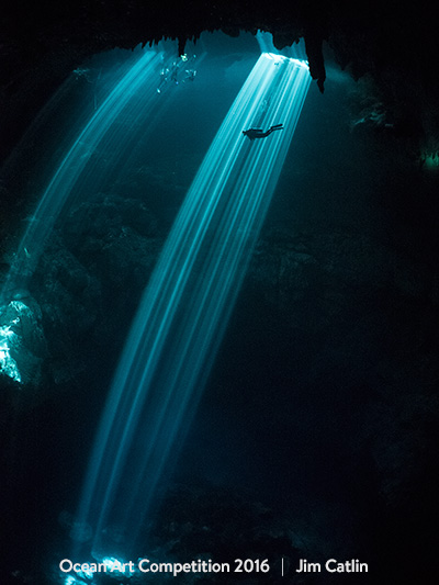 The Story: A diver hovers in the light beams of The Pit Cenote, Tulum, Mexico. This is first 30m from the surface but the Cenote itself extends to 119m deep. We arrived first thing to have the Cenote mostly to ourselves and I agreed with my buddy that she would ascend first into the beam on our ascent, to model for the shot. The very low light provided a challenge to capture the image requiring a high ISO and manual focus. I had to back up quite along way to capture the entire light beam in the frame but was very pleased with the sense of scale this gave the shot.