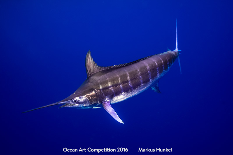 The Story:  Ilhéus das Formigas – with their very remote location, crystal clear waters and legendary marine life, these small islands are one of the best dive sites in the azores. Early in the morning we started in Santa maria. The trip itself can be a great adventure, allowing divers to spot turtles, seabirds, dolphins or something big like a whale. The sea was very calm and as we moved on everybody scanned his part of the horizon. Ten miles away from Santa Maria, suddenly a big dolphinfish jumped out of the water, doing it again even after we stopped the boat. We where not sure … but somehow felt there is perhaps something even bigger around. We hurried up getting the gear ready and went into the open ocean, at this point more than 1000 m deep. The dolphinfish was swimming around us and you could see, that he was already wounded … and then below us the predator who did it came into sight. A massive blue finned Marlin started circling around me, here and then sprinting with high speed again out of sight. I was deeply touched by this feral power, the elegance, the metallic-copper-blue-shining skin and this endless blue of an ocean with no reef or anker rope or anything destroying the purity of the moment. I tried to combine this with the massive speed of the action, especially the very second when the marlin turned right before us and accelerated like hell. Therefore not more than 1/125 to get some motion blur, slightly underexposed to underline this deep blue of the deep ocean and not much flash because of the skin being so reflective. Whenever diving again into this picture, i can recall the simple purity of this open ocean encounter.