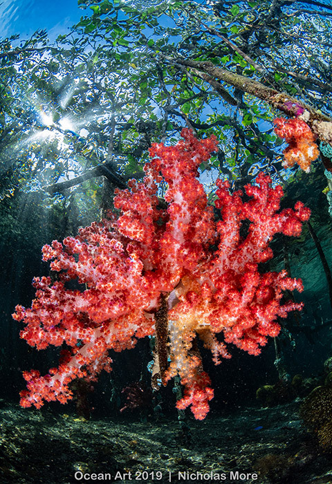 The Story: We were snorkelling the blue water mangroves around the Nampele Islands, Misool, Raja Ampat , West Papua, Indonesia. We found red soft corals (Dendronephthya sp.) growing attached to the roots of red mangrove trees (Rhizophora mangle) beneath the canopy of the mangrove forest. These soft corals made for a beautiful subject against a pretty and unusual background. Thankfully the resident salt water crocodiles did not make an appearance!!