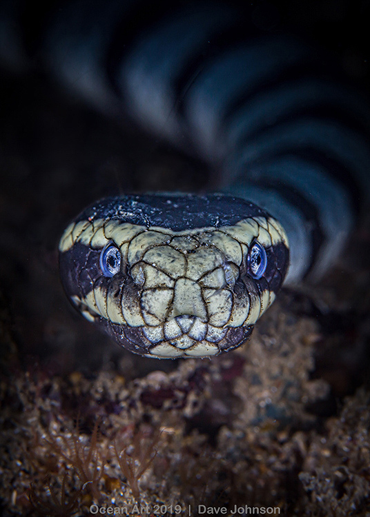 The Story: Unexpectedly we came across this Banded Sea Snake taking a nap on the sea bed at around 20 metres deep.  With the maxim in mind that “hesitation kills the shot” I headed way out in front of it so that it could see me approaching and not be spooked.  I slowly got nearer and nearer and ended up around 1 metre in front of it, flat on the sandy bottom, took around 6 shots (heart beating rapidly) and then left it where it was (seemed like a wise thing to do).  Post processing was just a crop to turn it into portrait presentation and some clarity adjustments in Lightroom.  I’ve never seen this behaviour before or since but people tell me where there’s one of these guys resting on the bottom that there are often others buried under the sand nearby!