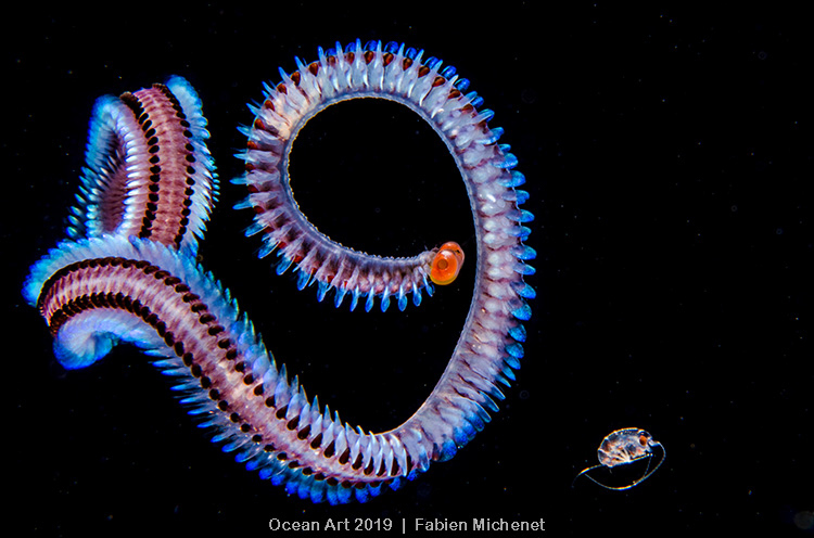 The Alciopid are characterized by their enormous globular eyes which are unique in worms. These eyes are particularly advanced with an iris, a cornea and a lens… they allow these nocturnal predators to find preys and to hunt in the pelagic environment.