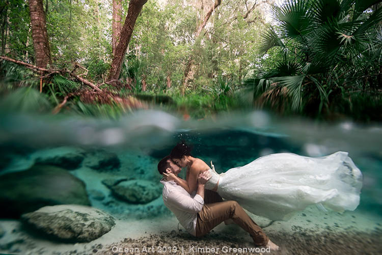Story behind the shot: This image features a bride and groom. It was photographed at Kelly Springs, in Apopka, FL. I used a Nikon d750, 17-35 mm lens, and Ikelite housing. My settings were 1/125, f2.8, and ISO 500. This is a two image composite. The current was intense so my assistant was holding me in place! I love underwater portrait work and this session was a dream come true!