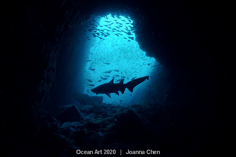 The Story: What better time to explore the wonderful local diving we have in Australia than the year that was 2020? This shot was captured on my first ever dive at South West Rocks, where we visited the famous Fish Rock cave and chimney – arguably one of Australia’s best dive sites. The cave opened up to this breathtaking scene of crystal-clear blue water at the aquarium — and usually this area is populated by dozens of Grey Nurse Sharks swimming around, but this particular autumn day, there was only one lone shark swimming solo. I hung around for ten minutes near the rocks at the bottom of the cave right at the opening, careful not to disturb any wobbegongs, and snapped away as the lone shark swam back and forth amongst the three different schools of fish. I decided not to use any strobes or artificial lighting in order to accentuate the silhouette of the shark and capture the beautiful ambient lighting from the cave mouth.