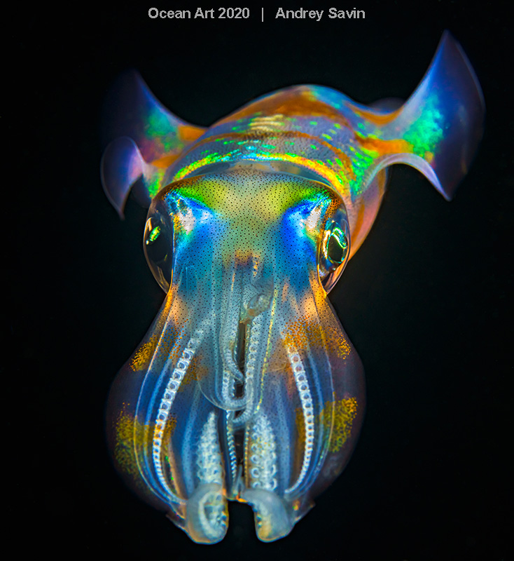 The Story: I quite often come to dive at night in the area of Bakong pier and on October 11 I was lucky – there was not a single large ship near the pier. The base of the pier is located at a depth of 17 m and that’s where I met a lone squid, which was resting near some kind of metal fragment. Near the pier, teenagers are engaged in spearfishing every evening, and the squid have become extremely shy. So I stopped and tried to breathe evenly and constantly gave him time to get used to. After 5-7 minutes, the squid itself became interested in the light of my flashlight and swam up to me at the distance of the shot. Trying to hardly move or breathe, I took about 30 shots. During processing, I noticed that the squid shimmers with all colors like a Christmas tree. I decided to enhance this effect in post-production and on Christmas Eve this photo got a lot of enthusiastic comments …