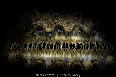 The Story: I love diving the cold, green waters of the Atlantic Ocean off the shores of New England. The marine life is abundant, unlike the singular experience of life on a reef. Marine life can be challenging to find though, since most of it blends in with the surroundings rather than standing out and because more than ten feet is considered exceptional visibility. This bay scallop was lying on the bottom of a shallow cove in Ft. Wetherill State Park, Rhode Island. Longfin squid, juvenile shrimp, blue crabs, seahorses, and more were nearby, begging for attention. Seen from the top, this scallop looked like one of many bivalves — relatively indistinguishable from the gray-brown bottom muck characteristic of this site. That is, until, my dive light caught its blue eyes. Risking a complete silt out, I lowered myself as much as possible in the water to settle level with the scallop. Seeing it through my viewfinder, and capturing the image using an optical snoot to enhance texture and depth, this benign (and tasty) creature looked more like a thing from my nightmares. My only regret is that my children are too old now for me to hang this photograph above their beds on April Fool’s Day.