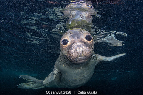 The Story: I spent the fall diving at the Coronado Islands to photograph the California sea lion pups as they were growing up. One day I had an extremely special meeting. It is a day I will never forget. The water had moderate surge so I stayed in a more protected area where there were many sea lion pups playing. All of a sudden, a juvenile Northern elephant seal appeared in front of me and was glowing almost like an angel appearing from the heavens. It is rare to see Northern elephant seals underwater and even more rare to see more than a fleeting glance of them, but she was very curious. She played in the shallows and I could not believe my incredibly good fortune of having the opportunity to spend time in her presence. It was the ultimate dream meeting.