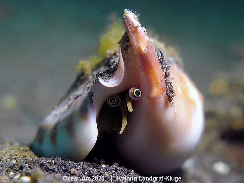 The Story: I took this photo during my first visit to Lembeh strait when I had just started to go a bit deeper into underwater macrophotography. Actually, I had not seen a Conch Snail before and I was fascinated by the cautious but also curious way it was looking at me. I tried to get a front shot with both eyes in focus. I had to move very carefully to not disturb the Conch Snail and finally got a shot of it looking back at me like it was trying to say ‘I AM just SHY’.