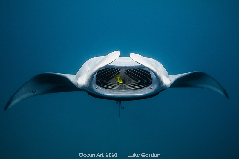 The Story: We know this particular reef manta ray very well, she is known affectionately as ‘Coco’ to researchers in the area. Coco is always accompanied by golden trevallies when we see her and with her huge size is always an impressive sight. On this particular day we had had amazing manta action throughout the day, as the afternoon drew to a close we could see a few individuals feeding just 100m or so from shore, I decided to head back in and spend some more time with these gentle giants. Once in the water I could see three individuals somersault feeding, one was Coco, as I was the only one in the water what ensued was pure magic. Coco spent a good 15-20 minutes with me, circling, somersaulting, fly-bys, she was fully interacting with me and it was a very special moment. As she was incredibly comfortable I began to take some shots as she somersaulted right in front of me. As she gracefully danced through the plankton I could see one particular golden trevally taking cover from me in Coco’s mouth everytime she somersaulted towards me, Coco would spit the fish out at the bottom of every turn, but as soon a she got back to the top the fish would hide away inside her mouth again. As the opportunity presented itself I quietly dived down and waited for Coco’s next somersault, I really wanted the fish to be looking at the camera and to have symmetry from Coco, positioning and timing was everything. I am proud to say after a couple of shots this was the result. A photo which for me tells a thousand words of the incredible experience I had that day.