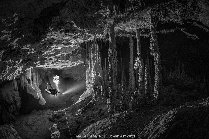 The Story: I joined Ellen Cuylaerts and my partner Julia Gugelmeier for a cave dive at Cenote Zacil Ha. After spending some time swimming through some very small passages the cave suddenly opens up and presents you with these giant speleothems which took millenia to form. The diver, Ellen, is dwarfed by the massive columns as she hovers awestruck and motionless, while Julia uses a video light to expertly backlight her and stay completely hidden from the camera (photographing in underwater caves is always a team effort!).