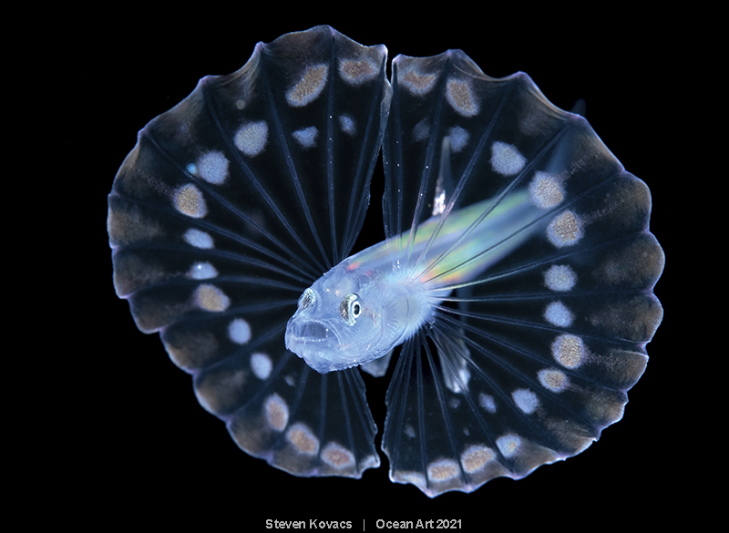 The Story: A favorite subject to encounter on a blackwater dive is the beautiful larval Tripodfish. Like many other larval fishes, the young of these species have large rounded fins that they can use to mimic Jellyfish in order to try and stay camouflaged from predators. The fins of these species are more spectacular than most other fish and the wide range of color variations that exist is truly breathtaking. The majority of the time these fins may be tucked in to the side or not symmetrically open so the trick to capture the true beauty of these fish is to photograph it when it fully opens up both sides symmetrically.