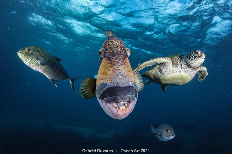 While swimming backwards a turtle that was eating at the bottom decided to rise to the surface to breathe, and it seems that for a short moment it stopped to observe what was happening. We can see how the Titan Triggerfish notices and makes eye contact with the turtle as if it were thinking of changing target, but as I probably was the bigger threat, the chase continued on me. Simultaneously, and in a synchronized fashion, a Trevally passes swimming in the opposite direction which gives me a unique opportunity to captured a three main subjects in one shot. In conclusion, even if for a short moment it was a bit of a stressful situation, the dive ended as a positive learning experience – first because I wasn’t hurt, and above all because the fish was just trying to defend it’s territory. As a diver we must understand and respect all marine life that surrounds us because we are the invaders in their environment.