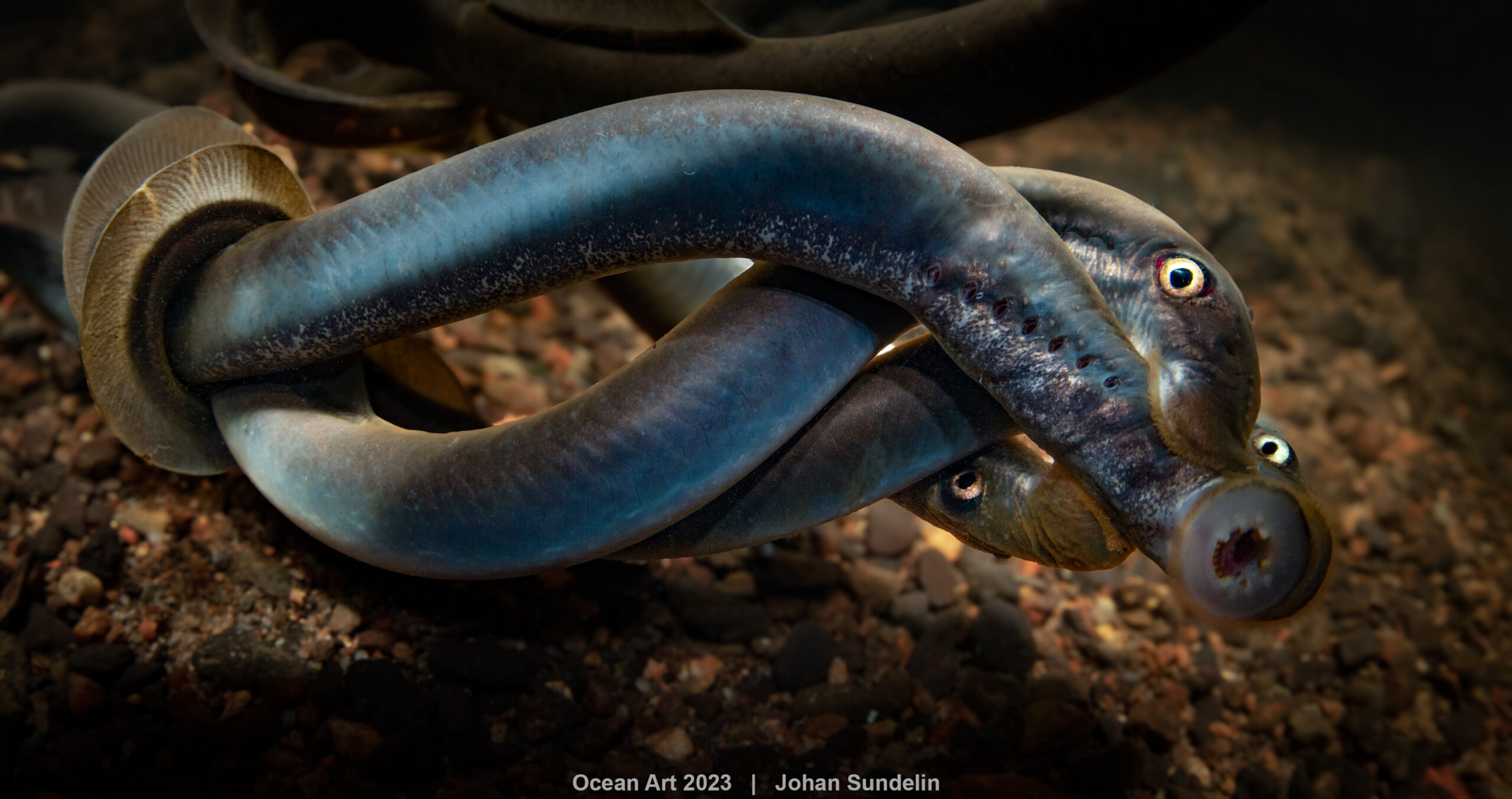 Birds play a crucial role as scouts for underwater activities, and this holds true for the small creek I’ve been observing for days in anticipation of spring spawning. The signal to enter the water came during a confrontation between goosanders and brook lamprey. The spawning event unfolded within a compact one-square-meter area over a couple of hours. The scene resembled a chaotic ball of yarn, presenting the challenge of capturing a simplified composition.