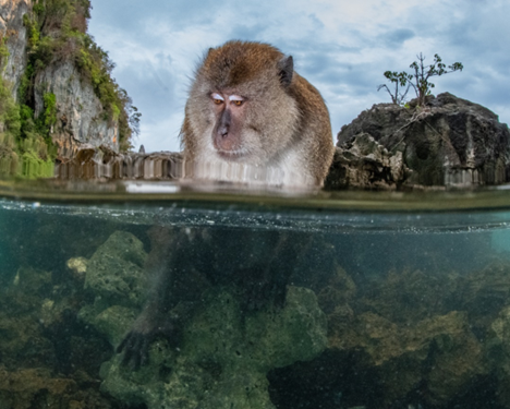 During fieldwork at Phi Phi Islands, Thailand, spanning several weeks, I focused my efforts on documenting the maritime behavior of the Crab-eating macaque with particular focus on their water forages. The macaques have adapted very well to living around the sea and will venture into the water for various reasons including transportation, scavenging, cooling down and playing. Highly efficient swimmers, they can dive for up to half a minute and can cover short distances faster than most humans. This photo offers a rare glimpse of the swimming movement of a male macaque.