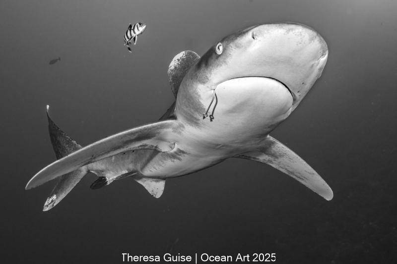 In the southern Red Sea, an Oceanic Whitetip Shark (Carcharhinus longimanus) stares into the lens, a painful testament to human impact: a large fishing hook is visibly embedded in its mouth. It approached me with curiosity and intent, as if to show the fishing hook. It passed directly overhead, within less than a meter. The image was processed in Lightroom to enhance exposure and converted to black and white to be more impactful.