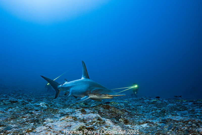 Antonin Guilbert and Nicolas Mollon, the two scientists working on the photos, are utilising a video photogrammetry system that consists of a plate-mounted video camera that has been laser-calibrated. By identifying individuals (photo identification), describing the sex ratio, and quantifying their size (laser calibration), this method enables the scientists to characterise Sphyrna mokarran populations. Scientists must employ sophisticated diving techniques like trimix gaz and close circuit rebreather in order to carry out the program.