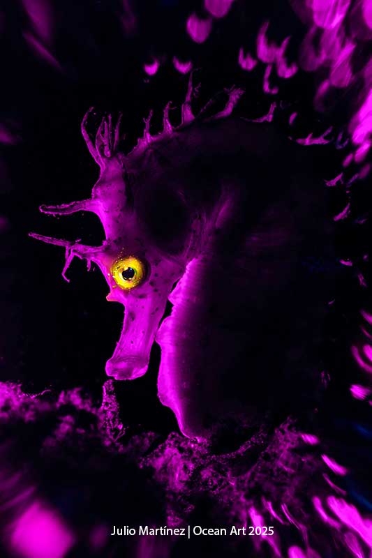 This is a seahorse (Hippocampus guttulatus) that I was able to follow for months and plan the photograph. I used a red light to illuminate the scene from the side and with the use of the snoot I illuminated softly only the seahorse’s eye to obtain its natural yellow colour. I completed the composition with a double exposure in camera to frame the protagonist using a special effects prismatic lens Halo filter. In the image processing I replaced and adjusted the colour of the scene until I achieved that purple-violet colour while maintaining the original lighting of the snoot on the eye.