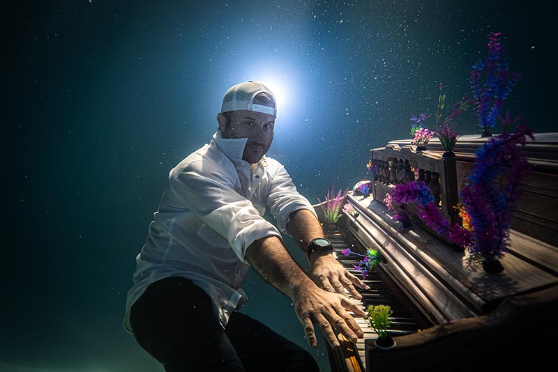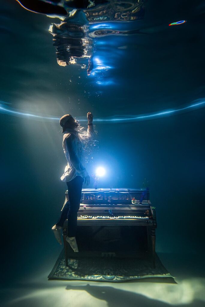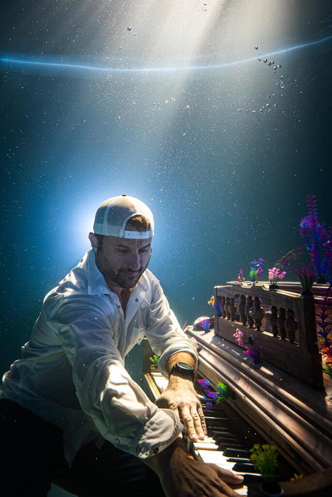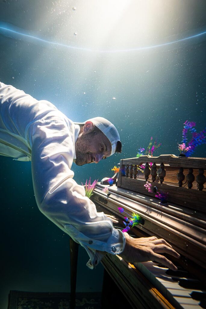 Captured the night before a promotional shoot for Austin musician Lindsay Walker and her new band, The Austinauts, this image began as a simple test of angles. It evolved into a beautiful intersection of our creative worlds. Featured in my studio pool is my partner, Matt Seabaugh—an avid pianist whose lifelong love for the keys provided the perfect focus for my passion for underwater photography.