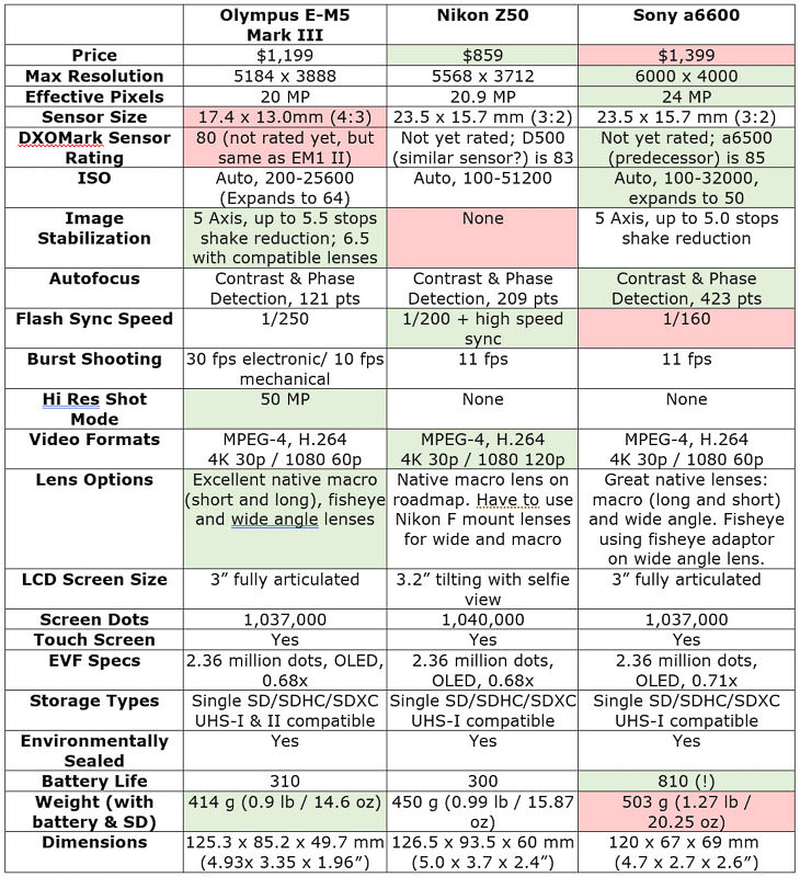 The main competitors for the OM-D E-M5 Mark III camera are other mid-range mirrorless systems, with close competitors being the recently released Nikon Z50, and the new Sony a6600. Here’s a breakdown of the specs.