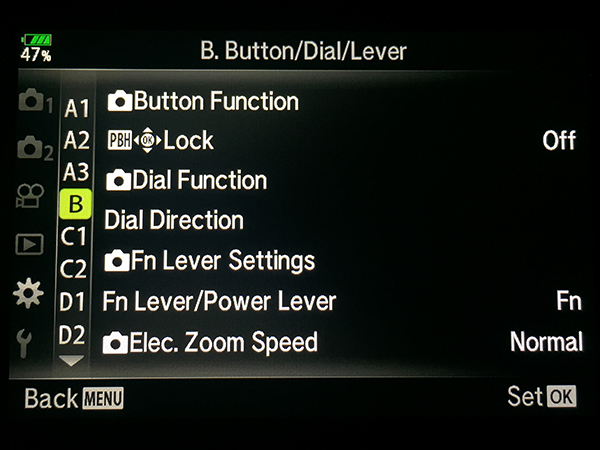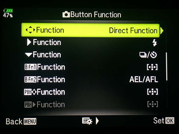 Button Function – There are 2 Fn buttons on the OMD and each has a variety of functions you can set. You can also customize the Rec button and assign its own function. Other settings in the Button Function menu allow you to modify the action of that key listed. To gain customization of the up and down arrows you need to change the setting of the four arrows option just below them. I recommend choosing Direct Function and setting the two customizable options for whatever best suit your needs.