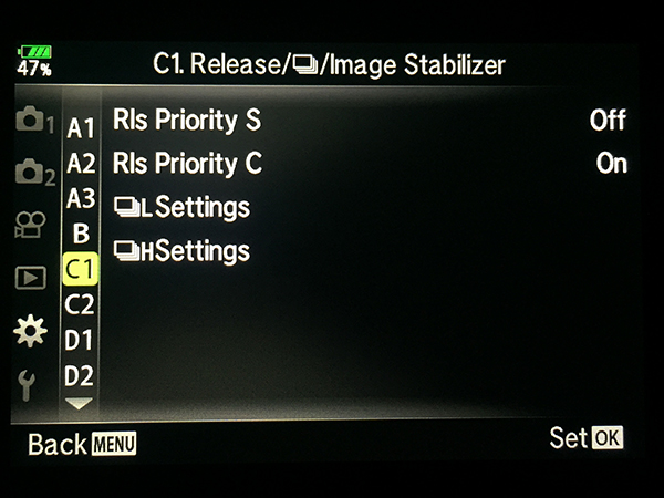 Menu C1: Release / Burst / Image Stabilizer