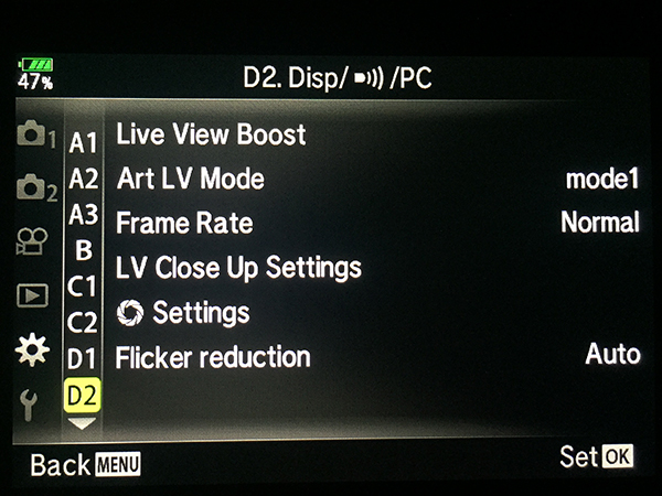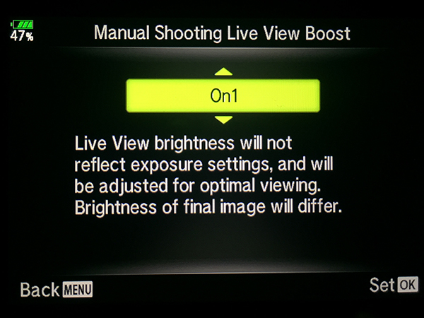 - Others – ON1 – this is for any other setting (P / A / S and Art Modes). Since these are auto settings, which should adjust other settings automatically you should always be able to compose based on the LCD, but to be safe turn ON the Live View Boost to always have a bright easy to see screen image.