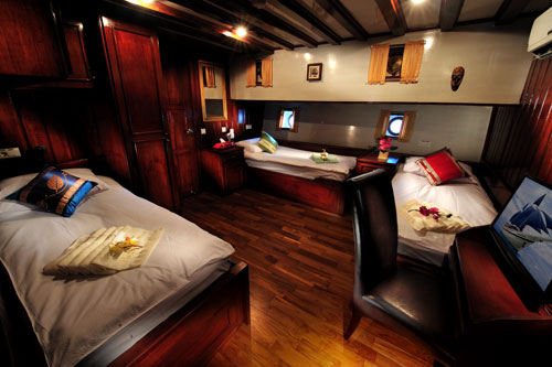 - 8 large air-conditioned cabins each with their own personal computer, audio-visual entertainment system and ensuite bathrooms with hot water. All rooms are lavished with luxury extra’s including bathrobes, hair dryers, towels, individually controlled mood lighting and individual controls for your air-conditioning unit.