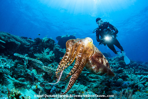 My dive buddy takes a closer look at a broadclub cuttlefish.