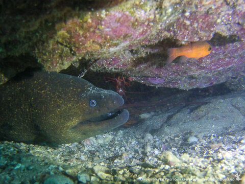 A moray eel and cardinalfish share a narrow crevice under a rock at Catalina Island – a shot unreachable with a bulkier camera/housing kit. Shot with SeaLife Micro 2.0.