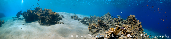 Photoshop’s panorama tool makes merging images very simple, however it’s still not perfect. A failure rate of 30% is quite normal due to the photographer’s “mistakes” while using the free-style panorama technique, so it’s always best to shoot each panorama series a couple of times. But after a little practice you will be able to shoot u/w images of a “different vision”!