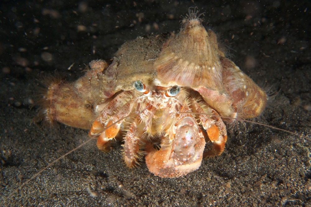 NEX-7 and 30mm lens, F11@1/60, ISO 400, Nauticam NA-NEX7 and macro port 45, 2 Sea & Sea YS-01 strobes, TTL control. Decorator Crab at night, Pemuteran, Bali, Indonesia