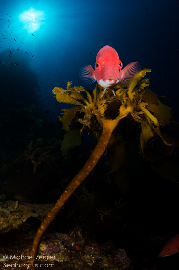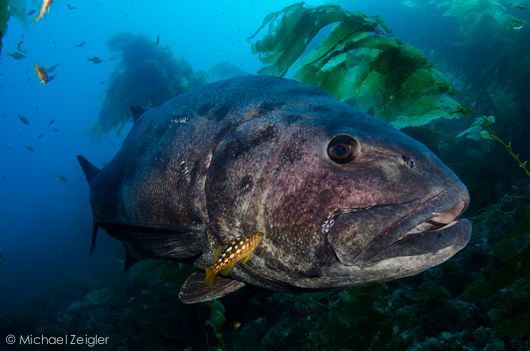 Giant Sea Bass at Catalina Island, CA. With this portrait in mind, I knew where these critters reside, and had an idea of the strobe settings/positions. After spotting it from afar, I took a few test shots to make sure I had the ambient light dialed in. Then I moved in very slowly, with relaxed breathing and avoiding direct eye contact (except through the viewfinder).